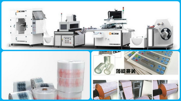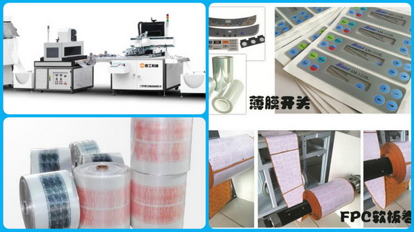 該機廣泛用于PET、PVC 、轉印紙(膜)、地暖膜、地熱膜、電熱膜、花紙、薄膜、銘板、柔性線路板、手機按鍵、3M膠、膠水、薄膜開關、商標鐳射、刮刮卡、不干膠標貼、桶裝紙、織帶、鋁箔、銅箔等卷筒材料的絲網印刷。